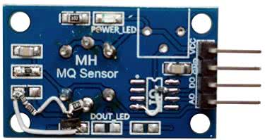 Elementy płytki modułu modMQ-7 pokazano na rysunku 5. Nie jest dostępny schemat modułu modMQ-7 [6], lecz jest on zbliżony do modułu MQ-7 Gas Sensor firmy Waveshare pokazanego na rysunku 6 [5]. Rezystor MQ_R2 ma wartość 1 kΩ (z równolegle dołączonym kondensatorem). Linia VCC jest połączona z szyną +5 V. Na wejściu VCC=+5 V znajduje się kondensator, wpięty pomiędzy VCC i GND.