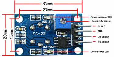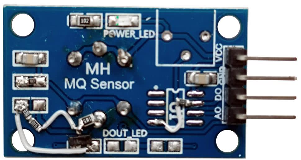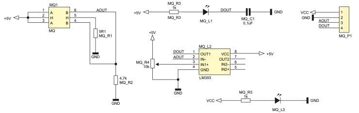 Zasilanie elementu pomiarowego i grzejnika MQ-7 jest dołączone do tego samego napięcia VCC. Prąd grzałki ogranicza rezystor MQ_R1. Nie ma możliwości zmiany napięcia zasilania grzałki. Napięcie z rezystora obciążenia MQ_R2 jest podawane bezpośrednio na wyjście AOUT oraz na wejście komparatora LM393. Poziom zadziałania komparatora można ustawić potencjometrem MQ_R4.