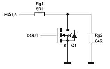 Rezystor Rg1 (5,1 Ω) należy dołączyć do wyprowadzenia 5 czujnika MQ1 oraz do tranzystora N-MOSFET (IRLML0060 [8]) i rezystora Rg2 o wartości 84 Ω. Tranzystor jest sterowany z wyprowadzenia DOUT – złącze MQ_P1.4 (wejście zamiast wyjścia).