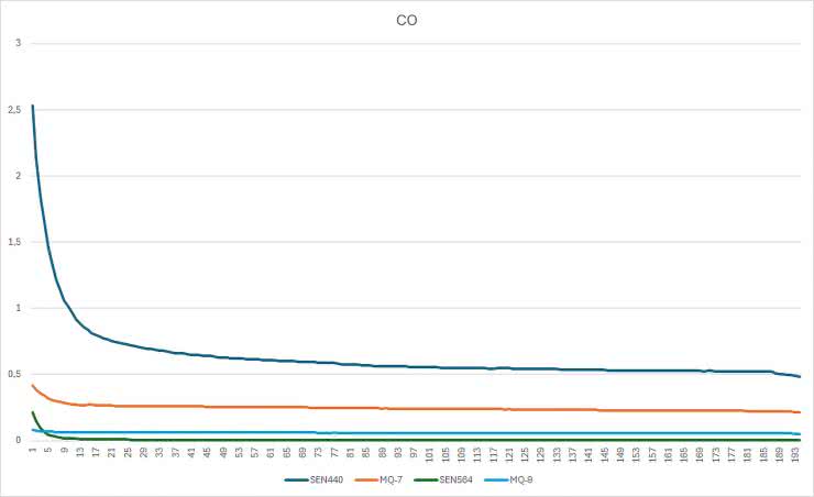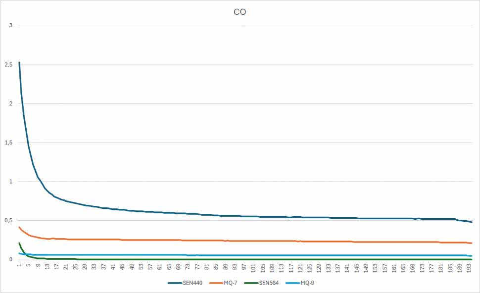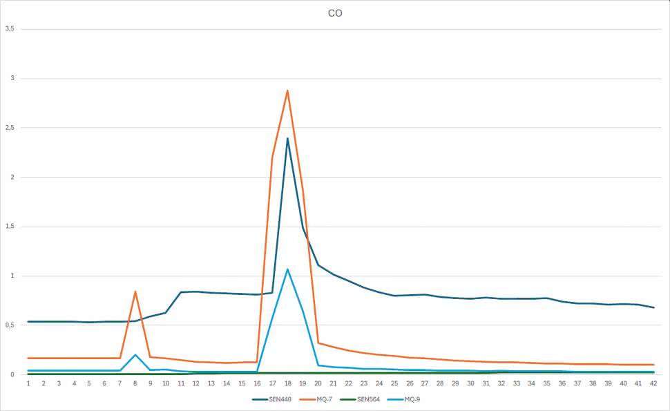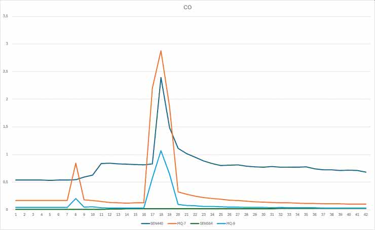 Przeprowadzone zostały bardzo proste eksperymenty z wykrywaniem gazu CO. Kolejny planowany eksperyment pomoże sprawdzić zachowanie tych czujników w porównaniu z nowoczesnym czujnikiem środowiskowym BME688.