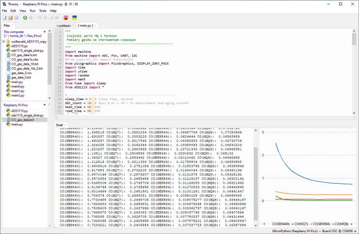 Przygotowanie środowiska programowego jest dokładnie opisane w artykule „Płytka Raspberry Pi Pico 2/2W z procesorem RP2350” [10]. W celu samodzielnego zbudowania opisywanego systemu należy pobrać i zainstalować najnowszy interpreter MicroPythona dla Pico 2 oraz kod aplikacji z pliku Gas_sensors.zip (https://ep.com.pl/files/mrl/13733-internet_rzeczy_w_pomiarach_srodowiskowych_18.zip).