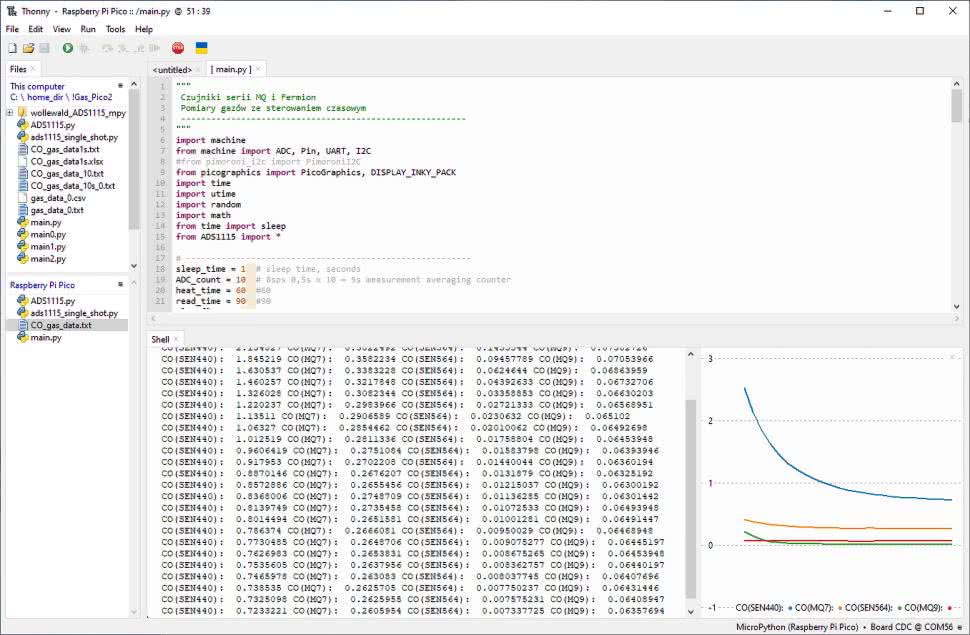 W prototypie zostały zastosowane moduły SEN0564 (GP2, AIN3) i SEN0440 (GP3, AIN0), zasilane napięciem 3,3 V dostarczanym przez moduł ADS1115 oraz moduły MQ-7 (GP1, AIN2) i MQ-9 (GP1, AIN4), zasilane z szyny VBUS (5 V). Zastosowano sterowanie kluczowania modułów (GP1…3) z fazą grzania 60 s i fazą pomiaru 90 s. Przetwornik ADC pracuje w trybie pojedynczego pomiaru z najdłuższym możliwym czasem przetwarzania (125 ms). Każdy pomiar jest powtarzany 10 razy i uśredniany. Wyniki pomiarów w czterech kanałach są wysyłane do aplikacji Thonny i w postaci liczbowej pokazywane do okna Shell oraz (w postaci wykresu) do okna Plot. Przykładowy widok środowiska Thonny w trakcie pracy aplikacji pomiarowej pokazano na rysunku 4.