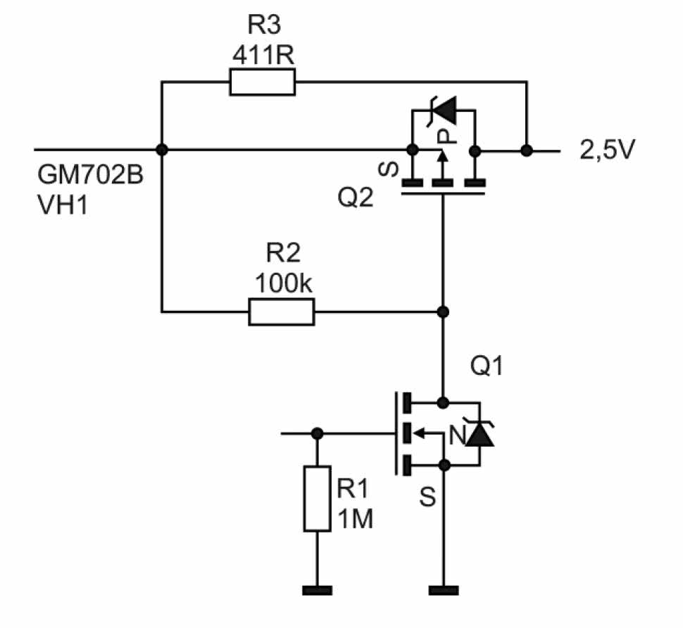 Niestety moduł SEN0564 nie umożliwia wymaganego przełączania napięcia zasilania grzejnika czujnika GM-702B. Można to zrealizować poprzez dodanie dwóch tranzystorów MOSFET oraz trzech rezystorów (rysunek 3). Przy niskim poziomie na wejściu CTRL oba tranzystory są wyłączone i grzejnik czujnika GM-702B jest zasilany poprzez rezystor R3 (411 Ω), dzięki czemu napięcie na grzałce wynosi około 0,5 V. Podanie wysokiego napięcia na wejście CTRL włącza oba tranzystory i zasilanie grzałki jest pobierane bezpośrednio z LDO 2,5 V. Warto dodać, że grzałka ma nieliniową charakterystykę rezystancji względem napięcia.