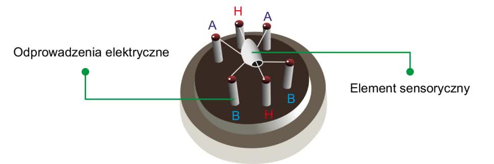 Po ostrożnym usunięciu zewnętrznej siatki można zobaczyć wnętrze czujnika (rysunek 1). W jego sercu znajduje się element czujnikowy przymocowany do sześciu metalowych nóżek, które wystają z okrągłej, plastikowej podstawy. Nóżki są ułożone w gwiazdę. Spośród sześciu pinów dwie (oznaczone jako H) służą do podgrzewania elementu pomiarowego i są połączone z cewką wykonaną ze stopu niklowo-chromowego. Ta specjalna mieszanka metali dobrze przewodzi prąd i może wytrzymać bardzo wysokie temperatury bez topienia się lub pękania.