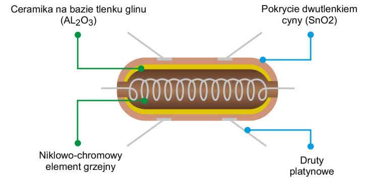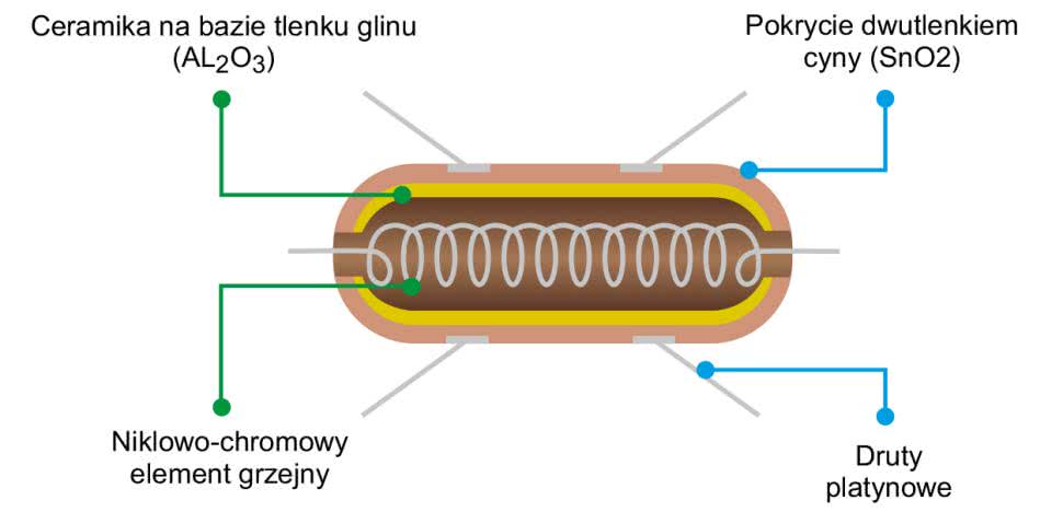 Sam element pomiarowy wygląda jak mała rurka (rysunek 2). Wykonany jest z ceramiki tlenku glinu (Al2O3), z cienką warstwą dwutlenku cyny (SnO2). Kluczowym materiałem jest tutaj dwutlenek cyny, ponieważ reaguje chemicznie z gazami łatwopalnymi, powodując zmiany rezystancji, które czujnik może zmierzyć. Ceramiczna obudowa również spełnia ważną funkcję. Zapewnia równomierne rozprowadzanie ciepła z grzejnika i utrzymuje czujnik w odpowiedniej temperaturze roboczej.