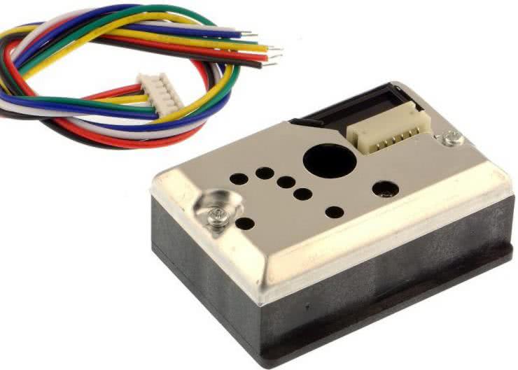 Czujnik zanieczyszczeń powietrza GP2Y1010AU0F firmy Sharp [1] wykrywa cząsteczki o średnicy powyżej 0,8 μm. Składa się z diody emitującej podczerwień (IRED) i fototranzystora, który wykrywa światło odbite od pyłu. Moduł szczególnie skutecznie wykrywa bardzo drobne cząstki, takie jak dym papierosowy. Czujnik charakteryzuje się relatywnie niskim poborem prądu, a napięcie na jego wyjściu jest liniowo skorelowane z wykrytym poziomem zanieczyszczeń. GP2Y1010AU0F znajduje zastosowanie w takich obszarach, jak systemy klimatyzacji oraz domowe stacje monitorujące jakość powietrza.