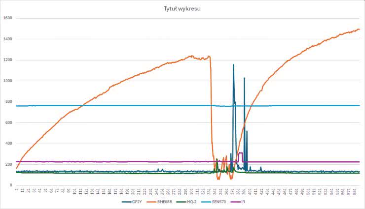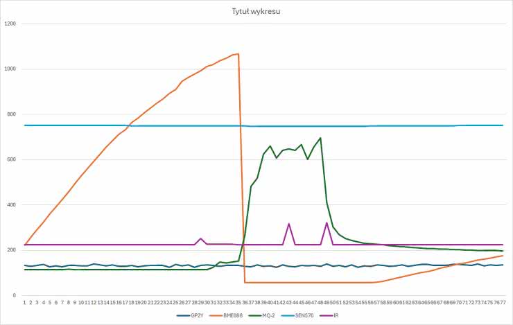 Przeprowadzone pierwsze próby zakończyły się pomyślnie. Największą czułość na dym wykazał czujnik BME688 (przy długim czasie powrotu do stanu początkowego) oraz czujnik GP2Y1010AU0F (pomijając problem ze słabym przepływem powietrza). Czujnik MQ-2 wykazał szybką i wyraźną odpowiedź, ale dopiero na dosyć wysoki poziom dymu. Brak reakcji czujnika SEN570 wymaga dodatkowych badań. Czujnik IR został dołączony dodatkowo i zachęca do zajęcia się zagadnieniem wykrywania płomienia.