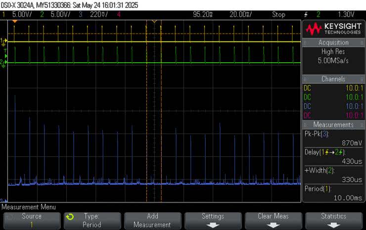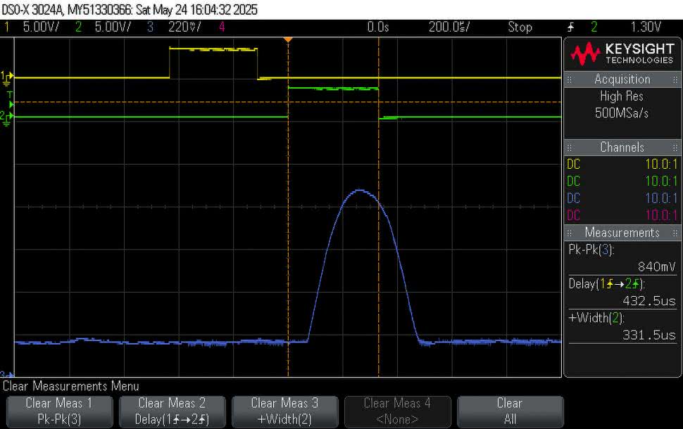 Odpowiedź napięciowa czujnika GP2Y1010AU0F w czystym powietrzu została pokazana na rysunku 6. W kanale CH2 widać sygnał sterowania diody LED czujnika (320 μs). W kanale CH3 mierzona jest natomiast odpowiedź napięciowa czujnika. Jest ona prawie zgodna z katalogową.