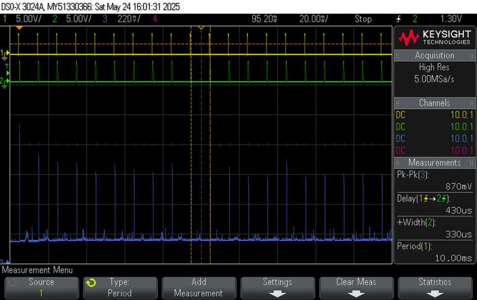 - pomiar po włączeniu diody LED Tp: 0,28 ms,