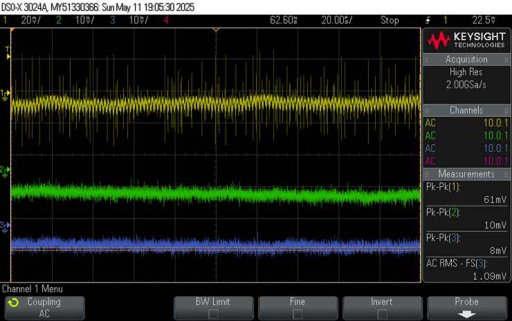 Do prób wybrano płytkę z przetwornicą MP3424A firmy Monolithic Power Systems (580 kHz, 3,1 A) z dołączoną na wyjściu płytką LT3045 (LDO 5 V) i następnie z filtrem BNX029. Przykład pomiaru takiego toru zasilania jest pokazany na rysunku 5. Tor jest zasilany z zasilacza laboratoryjnego (3,7 V, 473 mA). Takie same rezultaty zostały uzyskane przy zasilaniu z jednego ogniwa LiPo (3,7 V). Kanał 1 to wyjście MP3424 (5,63 V), kanał 2 – wyjście BNX029 (4,97 V, obciążenie ok. 320 mA), kanał 3 – wyjście analogowe czujnika. Zakłócenia szpilkowe zniknęły i pozostał szum biały (łatwy do odfiltrowania z zastosowaniem uśredniania). Pomiary zostały wykonane oscyloskopem DSO-X 3024A o paśmie 350 MHz, współpracującym z sondami 700 MHz [9].