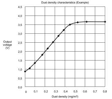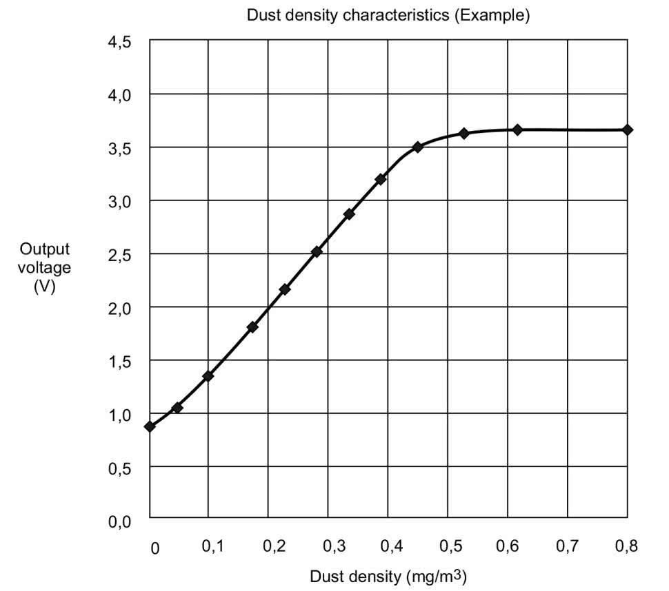 Napięcie wyjściowe Vo czujnika jest sumą napięcia wyjściowego przy braku pyłu (Voc) i przyrostu napięcia proporcjonalnego do gęstości pyłu (ΔV). Przykładowa zależność napięcia wyjściowego od gęstości pyłu jest pokazana na rysunku 4.