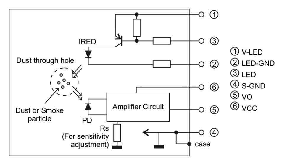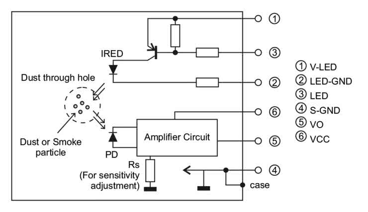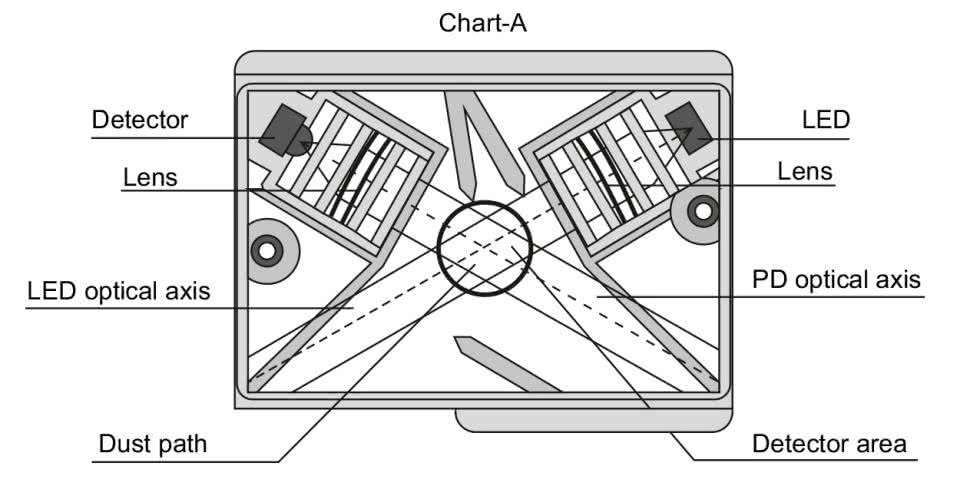 Światło z emitera (diody elektroluminescencyjnej) jest skupiane przez soczewkę i ograniczane za pomocą szczeliny (rysunek 1). Układ soczewki i szczeliny jest także umieszczony przed detektorem światła (fotodiodą), aby odciąć światło zakłócające i wykryć skutecznie tylko odbicie światła od kurzu. Obszar, w którym te dwie osie optyczne się przecinają, jest obszarem detekcji czujnika. Napięcie wyjściowe – przy braku kurzu – jest określone w specyfikacji jako Voc. Dzieje się tak, ponieważ światło emitowane przez diodę LED odbija się od obudowy urządzenia, a część z niego dociera do detektora. Gdy we wnętrzu czujnika znajduje się kurz i/lub dym papierosowy, to detektor wykrywa światło odbite od cząstek. Prąd, proporcjonalny do ilości światła wykrytego przez detektor, jest wzmacniany i urządzenie generuje analogowy sygnał napięciowy na wyjściu impulsowym.