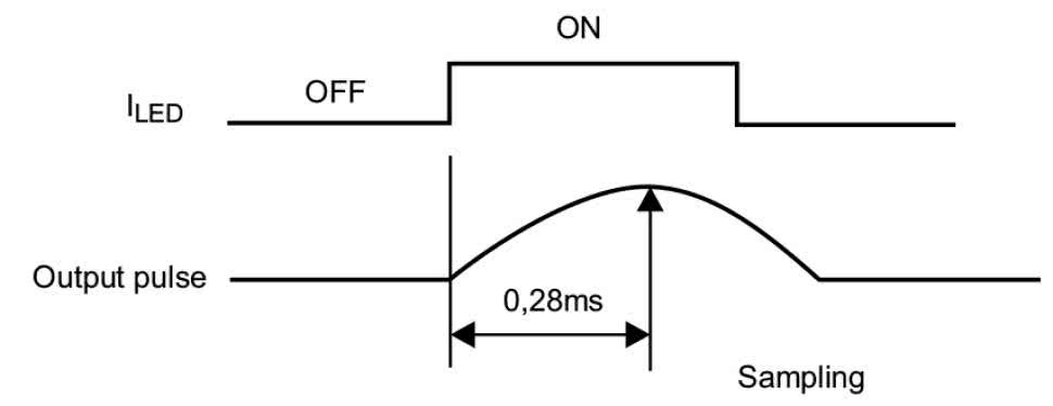 Czujnik wymaga impulsowego sterowania diodą LED. W dokumentacji do kluczowania zalecany jest tranzystor MOS [2]. Impulsy sterowania Pw = 0,32 s są powtarzane co T=10 ms. Pomiar napięcia wyjściowego powinien być wykonywany w czasie 0,28 ms po włączeniu diody LED (rysunek 3).
