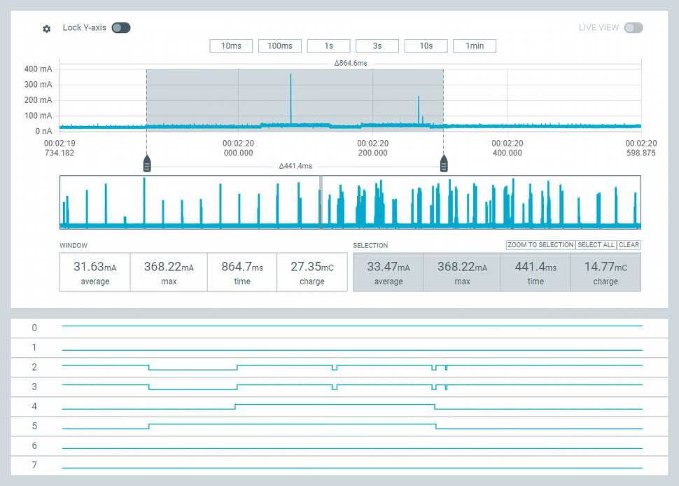 Do dynamicznego pomiaru prądu zasilania bardzo dobrze nadaje się zestaw Power Profiler Kit II (PPK2) firmy Nordic Semiconductor. Dokładny opis urządzenia można znaleźć w artykule „Profilowanie mocy z zastosowaniem Power Profiler Kit II” [15].