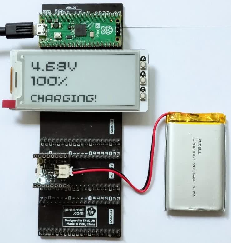 Płytka Li-Po SHIM nie wymaga oprogramowania. Producent udostępnia natomiast przykładowy program w języku Python do pomiaru napięcia akumulatora – wymaga on dołączenia wyświetlacza, np. Pico INKY (fotografia 1). Program sprawdza obecność napięcia na szynie VBUS zasilanej z gniazdka USB poprzez odczyt stanu wejścia GP24 z dzielnika rezystancyjnego (1/2), dołączonego do szyny VBUS. Wykonuje też odczyt podzielonego napięcia (1/3) szyny VSYS z wejścia ADC3 (GP29). Odczyt ten jest niedokładny ze względu na bardzo zaszumione zasilanie wewnętrznego przetwornika ADC procesora.