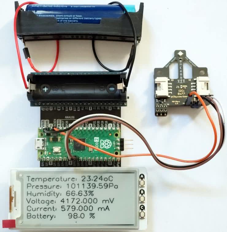 Oprogramowanie zrealizowane w języku MicroPython wykorzystuje płytkę Raspberry Pi Pico 2, wyświetlacz Pico Inky Pack, czujnik środowiskowy BME688, płytkę miernika prądu z układem INA219, akumulator Li-Ion i ładowarkę. Całość jest wzorowana na firmowym programie dla modułu Li-Po SHIM for Pico firmy Pimoroni.