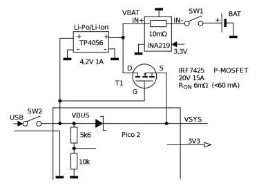 W projekcie został zastosowany tranzystor MOS o niskiej rezystancji. Tranzystor pozostaje wyłączony, gdy na szynie VBUS jest obecne napięcie – szyna VBAT ładowarki jest wtedy odłączona. Przy braku napięcia na szynie VBUS, tranzystor zostanie włączony i napięcie z akumulatora jest praktycznie bezpośrednio (poprzez rezystancję RDS(on) równą około 18 mΩ) podawane na szynę VSYS płytki Pico 2.