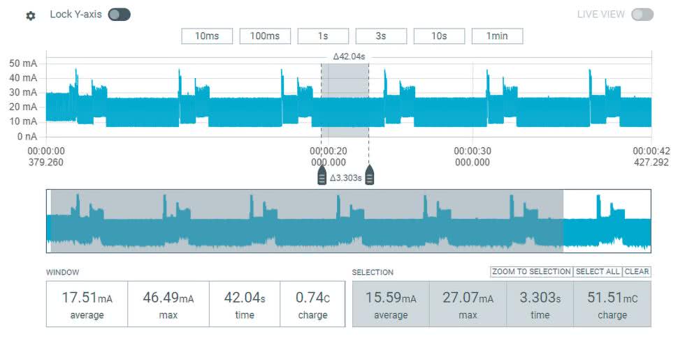 Próba zastosowania PPK2 w trybie miernika do pomiaru prądu akumulatora nie powiodła się. Po podaniu zasilania z ogniwa poprzez miernik procesor nie był w stanie się uruchomić. Pico2 ma duży prąd rozruchowy rzędu 0,6 A. Prawdopodobnie problem jest spowodowany zbyt dużą rezystancją wewnętrzną PPK2 na początku pomiaru (automatyka zakresów). W tej sytuacji PPK2 został zastosowany w trybie zasilacza i dołączony do układu w miejsce akumulatora, podając napięcie 4,076 V. Dynamiczny pomiar prądu zasilania układu z „akumulatora” został pokazany na rysunku 3. W okresie pracy procesora w trybie sleep pobór prądu wynosi ok. 16 mA i ta wartość zgadza się z pomiarem dokonanym przez INA219. Wartość średnia jest trochę wyższa.