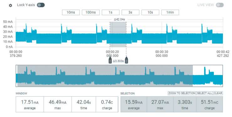 Do dynamicznego pomiaru prądu zasilania bardzo dobrze nadaje się zestaw Power Profiler Kit II (PPK2) firmy Nordic Semiconductor. Jest to samodzielny układ, który bez zewnętrznego sprzętu może mierzyć i dostarczać prądy od poniżej 1 μA do 1 A. Praktyka pokazuje, że zakres pracy rozciąga się do ok. 2 A, wymaga to jednak dołączenia dodatkowego portu USB do drugiego gniazdka PPK2. Bardzo przydatne jest osiem kanałów cyfrowych próbkowanych synchronicznie z odczytem prądu. Dokładny opis PPK2 jest zamieszczony w artykule „Profilowanie mocy z zastosowaniem Power Profiler Kit II” [10].