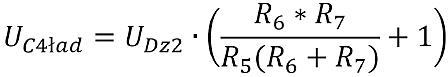 Gdyby układ się nie włączył po pierwszym naładowaniu kondensatora C4 np. z powodu zwarcia wyjścia ładowarki lub zbyt dużego obciążenia, napięcie z C4 obniżające swoją wartość z powodu przewodzenia tranzystora T1 zmieni poziom wyjściowy komparatora U3A na niski przy jego wartości wyznaczonej tym razem przez równanie