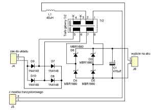 Liczbę zwojów uzwojeń Tr2 zmienia się odwrotnie proporcjonalnie do przekroju rdzenia (większy rdzeń np. E42, mniej zwojów na Volt). Dla rdzenia E42 i karkasu WE-2154-1S będzie to odpowiednio na uzwojenie pierwotne 115 zwojów, na wtórne 8 zwojów, a na pomocnicze 10 zwojów. Uzwojenie pierwotne będzie nawinięte trzema drutami o średnicy 0,4 mm, wtórne 34 drutami o tej samej średnicy, a uzwojenie pomocnicze 1×0,4 mm, co da wydajność prądową ładowarki ponad 17 A. Urządzenia o takiej mocy powinny być wyposażone w szeregowo połączony z zasilaniem 230 V dławik, np. taki, jak do niedawna był stosowany w zasilaczach komputerowych tzw. filtr PFC służący do wygładzania szpilek prądu ładujących kondensatory filtrujące.
