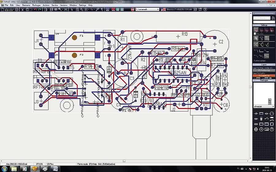 Rysunek 4. Rozmieszczenie elementów i widok ścieżek od strony elementów (niebieskie) i miedzi (czerwone). Zrzut ekranu z programu Target 3001! V15