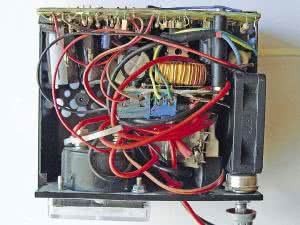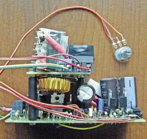 Płytki po sprawdzeniu skręcamy dwiema śrubami M3×40 mm z nałożonymi tulejkami dystansowymi np. TDYS3.6/35 (fotografia 7) o średnicy wewnętrznej nieco większej od 3 mm i długości około 35 mm. W obudowie trzeba wywiercić lub wyciąć otwory wentylacyjne, aby powietrze przepływało z lewego tylnego boku obudowy do prawego przedniego boku obudowy zasysane od spodu i wydmuchiwane naciętymi otworami w bocznej ściance obudowy. Po podłączeniu wszystkich przewodów i usunięciu w obudowie występów przeszkadzających w umieszczeniu płytek i wentylatora umieszczamy układ w obudowie (fotografia 8). Otwory w płytkach są tak wykonane, aby obok płytki z Tr2 zmieścić wentylator o grubości 15 mm, a z lewej strony amperomierz 51 mm×51 mm wskazujący prąd ładowania.