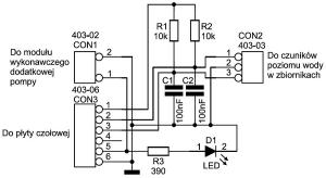 Na rysunku 6 pokazano schemat przystawki pompy pomocniczej. Rezystory R1 i R2 podciągają linie czujników poziomu wody do napięcia zasilania, a kondensatory C1 i C2 niwelują drgania styków. Do złącza CON1 jest przyłączony dodatkowy moduł wykonawczy pompy pomocniczej. Dioda D1 stanowi kontrolkę załączania pompy pomocniczej.