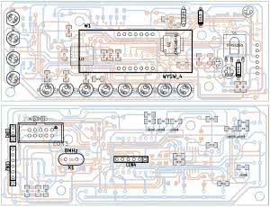 Schemat montażowy panelu czołowego zamieszczono na rysunku 9. Zmontowano go na dwustronnej płytce drukowanej. Montaż należy rozpocząć od wlutowania rezystorów i kondensatorów SMD po obu stronach płytki. Następnie montujemy elementy przewlekane: rezystory, dławik, kondensatory i diody, rezonatorX1 i złącza.