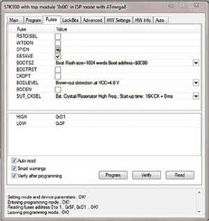 Rezonator i złącza są montowane od spodu płytki. Teraz montujemy półprzewodniki: tranzystory, układ U1 oraz procesor U2 i ekspander U3. Wyświetlacz W1 zostawiamy na sam koniec. Po sprawdzeniu poprawności montażu można zaprogramować mikroprocesor ustawiając fusebity, jak na rysunku 10.