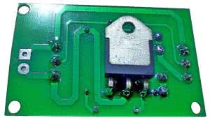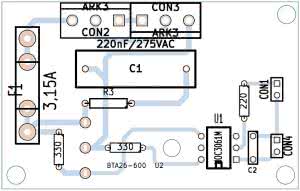 Na rysunku 14 pokazano schemat montażowy układu wykonawczego pompy pomocniczej. Jest on zmontowany na płytce jednostronnej. Sposób montażu jest taki sam, jak w wypadku płytki radiatora - triak jest przylutowany od spodu płytki. Od radiatora jest odizolowany podkładką silikonową posmarowaną pastą silikonową. Należy pamiętać, aby radiator był połączony elektrycznie z przewodem PE.