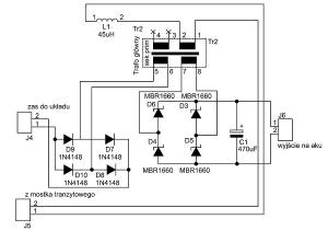 Transformator Tr1 jest nawinięty na karkasie WE-1952V i ma rdzeń E20/10/6 z materiału 3C90, ale można wykorzystać inny materiał i inne karkasy o podobnych właściwościach np. 3F3. Uzwojenia wtórne, to cztery oddzielne uzwojenia liczące po 30 zw. DNE 0,3 mm. Uzwojenie pierwotne ma 35 zw. DNE 0,4 i nawijamy je na wierzchu.