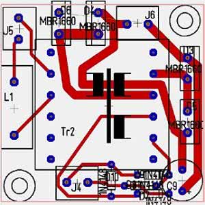 Modelowa ładowarka została wykonana na dwóch samodzielnie wykonanych płytkach drukowanych, z których płytka kontrolera jest na laminacie dwustronnym, a transformatora głównego Tr2 z układem prostowniczym i kondensatorem wyjściowym na jednostronnym. Jeśli ktoś skorzysta z wzorów płytek zamieszczonych na rysunkach 3...6, to montaż elementów powinien rozpocząć od wlutowania przelotek, zworek oznaczonych na płytkach zieloną linią - jednej na płytce transformatora Tr2, dwóch na płytce kontrolera SG.