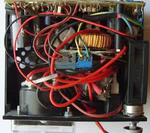 Otwory w płytkach są tak wykonane, aby obok płytki z Tr2 zmieścić wentylator o grubości 15 mm, a z lewej strony amperomierz o wymiarach 51 mm×51 mm wskazujący prąd ładowania. Obwody ładowarki zamontowane w obudowie pokazano na fotografii 8.