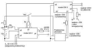 W układzie modelowym przetwornicę załącza stycznik Sp, którego styk (styki) NO są połączone szeregowo z dodatnim przewodem zasilającym przetwornicę. Mając dostęp do wnętrza przetwornicy można dołączyć złącze z3 poprzez styki NO niewielkiego przekaźnika lub bezpośrednio, w zależności od budowy przetwornicy, zamiast przycisku załączającego zasilanie przetwornicy, eliminując drogi stycznik Sp.
