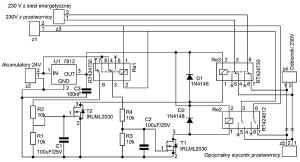 Gdy napięcie z przetwornicy zaniknie, przekaźnik Re1 wyłączy się, zewrze swoje styki NC powodując szybkie ładowanie napięciem z baterii akumulatorów 24 V (Z2) kondensatora C2 poprzez stabilizator U1, styki NC przekaźnika Re1 i rezystor R4. Gdy napięcie na bramce T1 przekroczy około 2,5 V, zacznie on przewodzić włączając przekaźnik Re2 i rozwierając jego styki NC, co spowoduje przerwanie obwodu zasilania odbiorników napięciem z przetwornicy.