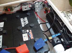 Połączenie z akumulatorami można rozwiązać, na fot. 8. Prąd do stycznika przetwornicy Sp jest doprowadzany przez dwa równolegle połączone gniazda bezpieczników dla bieguna dodatniego - to samo można zrobić dla ujemnego. Są one połączone z przewodami konektorami (np. 1-160304-2) zaciśniętymi na przewodach o przekroju 10 mm².