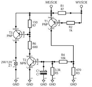 Gdyby nie było kondensatora C1, to podczas awarii jednego ze świateł np. hamowania na krótki czas mignęłaby lampka kontrolna tego obwodu, a w ten sposób lampka nie zaświeci się, co jest oznaką niesprawności świateł. Oczywiście, pojemność C1 wprowadza pewne opóźnienie w działaniu lampki kontrolnej, ale nie jest ono aż tak duże i nie sprawia problemów podczas użytkowania. Napięcie z kondensatora oraz dzielnika jest doprowadzone na bazę tranzystora T2, który pracuje w układzie wzmacniacza ze wspólnym emiterem. Jeśli poprzez złącze baza-emiter tranzystora T2 popłynie prąd ok. 0,9 mA, tranzystor przejdzie w stan nasycenia, powodując przewodzenie tranzystora T3 i załączenie kontrolki włączonej w obwód jego kolektora.