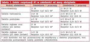 Jeśli jest zabezpieczony obwód świateł cofania, przeciwmgłowych czy postojowych, można nie montować kondensatora C1. W tabeli 1 podano wartości rezystancji oraz mocy rezystorów pomiarowych w zależności od mocy kontrolowanego obciązenia.