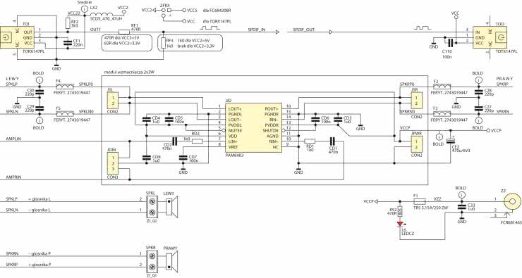 Na karcie zamontowałem optyczne wejście S/PDIF (Fiber optic) na bazie odbiornika TOI(TORX147PL albo FC684208R). Na wyjściu tego odbiornika dodałem szeregowy rezystor RF1 (82R lub 470R) oraz rezystor RF3 (1 kΩ lub brak) dołączony do masy, aby uzyskać właściwy poziom sygnału SPDIF_IN. Jeśli typ zastosowanego odbiornika (FC684208R) wymaga zasilania napięciem +5 V rezystory RF1 i RF3 mają odpowiednio 470 Ω i 1 kΩ – tworzą dzielnik napięcia. Dla odbiornika (TORX147PL) wymagane jest napięcie zasilania równe +3,3 V. Wtedy rezystor RF1 ma 82 Ω, a rezystora RF3 nie montujemy. Sygnał SPDIF_IN jest doprowadzony do przełącznika SW1. Sygnał z odbiornika optycznego (SPDIF_INX) trafia na wejście układu PCM2902C tylko dla pozycji 3 tego przełącznika. Zasilanie odbiornika jest poprowadzone przez dławik LX2(47 mH).