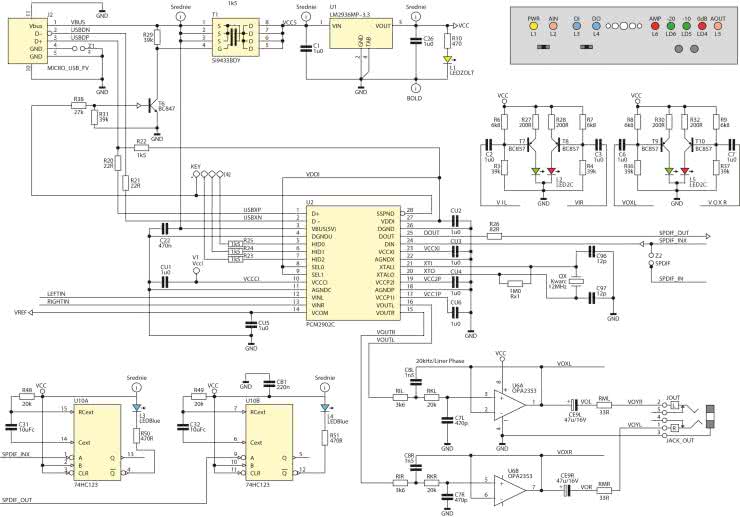 Stany wejść i wyjść sygnalizują diody LED. Sygnały SPDIF mają częstotliwość na poziomie 2 do 3 MHz (zależnie od ilości transmitowanych „1” w sygnale). Diody sygnalizujące obecność „prostokątnych” przebiegów SPDIF sterowane są przerzutników monostabilnych 74HC123 (U10A, U10B). Dla wejść i wyjść analogowych zbudowałem na tranzystorach T7, T8, T9 i T10 proste źródła prądowe sterowane ujemnymi połówkami sygnałów sinusoidalnych. Pary tranzystorów sterują dwukolorowe diody LED (L2 i L5).