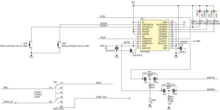 Układ MAX5486 jest dodatkowo wyposażony w wskaźnik położenia „suwaków” potencjometrów poprzez 5 diod LED podłączonych do wyjść LEDIND0..4. Zamontowałem 3 „najstarsze” diody (LEDIND2… LEDIND4) sygnalizujące tłumienie od 0 do –28 dB. Diody LED świecą w kilku poziomach jasności reagując na każdy krok (2 dB) ustawienia potencjometru. Dla tłumienia 0 dB świecą się wszystkie diody z maksymalnym wysterowaniem. Zmniejszanie poziomu głośności powoduje coraz słabsze świecenie diody LEDIND4. Po osiągnięciu poziomu –10 dB dioda LEDIND4 gaśnie całkowicie. Dalsze zmniejszanie głośności powoduje podobne zmniejszanie jasności diody LEDIND3 itd.