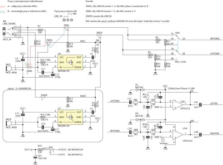 Układ scalony MAX9812H/L jest przeznaczony do wzmacniania sygnałów audio z mikrofonów (pojemnościowych). Posiada w swej strukturze niskoszumowy wzmacniacz o ustalonym na +20 dB wzmocnieniu, oraz wyjście (BIAS) napięcia polaryzacji mikrofonu. Wartość napięcia na wyjściu BIAS jest ustalona na stałe i wynosi 4,0 V dla układów serii H (Vcc=5 V) oraz 3,3 V dla układów serii L (Vcc=3,3 V). Napięcie stałe na wyjściu BIAS charakteryzuje się małym poziomem szumów. Układy MAX9812H/L montowane są w 6-nóżkowej obudowie SOT-23. Na płytce umieściłem 2 układy MAX9812H – jeden dla kanału lewego, drugi dla kanału prawego. Przewidziałem zamontowanie 2 mikrofonów pojemnościowych typu MCE-4000. Mikrofony są ustawione względem siebie pod kątem 90 stopni. Pozwala to uzyskać efekt stereofoniczny. Można nie montować mikrofonów na płytce. W takim przypadku po odpowiednim ustawieniu zworek (ZMOL, ZMOR, ZMEL oraz ZM) można podłączyć poprzez złącze JIN mikrofon mono. Czułość wejścia mikrofonowego lub LINE IN można regulować przełącznikiem SW2. Czułość tego wejścia (tłumienie) można ustawić na 0, –3 albo –6 dB.