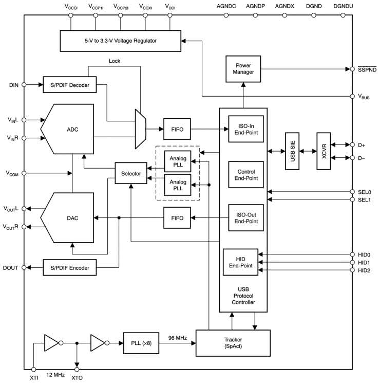 Ten układ ma wszystkie bloki potrzebne do zbudowania karty dźwiękowej. Codec zasilany jest z portu USB. PCM2902C ma wbudowany stabilizator napięcia 3,3 V do zasilania wewnętrznych bloków funkcjonalnych. Linie D+ i D– przez interfejs USB komunikują się z blokiem „USB Protocol Controller”. Blok ten jest odpowiedzialny za (szeregową) transmisję danych z przetwornika A/C lub dekodera S/PDIF oraz do przetwornika C/A i enkodera S/PDIF. Blok ten również umożliwia odczyt trzech przycisków (wejścia HID0, HID1 i HID2). Mogą one pracować jako przyciski „Volume+”, „Volume–” oraz „Mute”. W prototypie nie zamontowałem tych przycisków.