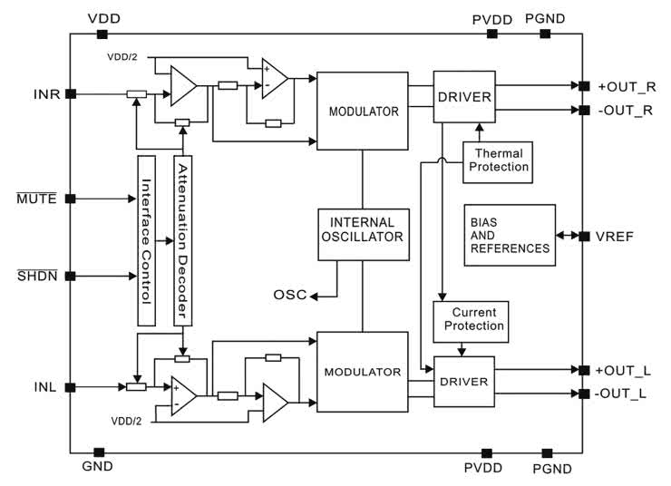 Układ ten jest stereofonicznym wzmacniaczem pracującym w klasie D. Jego budowę ilustruje schemat blokowy na rysunku 2. Podobnych wzmacniaczy znajdziemy dużo w ofercie różnych firm. O wyborze akurat tego układu zdecydowało jego kilka zalet:
