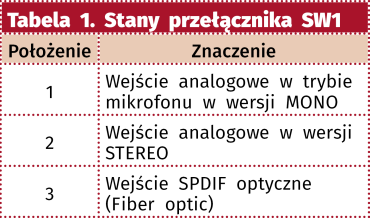 Wyjście optyczne obsługuje nadajnik TOO(TOTX147PL). Wejściowy sygnał (SPDIF_OUT) dla tego elementu pochodzi wprost (przez szeregowy rezystor 82 Ω) z odpowiedniego (DUOT) wyjścia układu PCM2902C. Przełącznik SW1 pozwala na wybranie źródła wejściowego dla układu PCM2902C. W pozycji „1” jest aktywne wejście analogowe – dla zworek ustawionych w tryb wejść mikrofonowych podawany sygnał jest w wersji MONO. W pozycji 2 aktywne jest również wejście analogowe, ale podawany sygnał jest w wersji STEREO. W pozycji „3” tego przełącznika aktywne będzie wejście cyfrowe S/PDIF, jeśli do odbiornika TOI został doprowadzony prawidłowy cyfrowy sygnał przez przewód światłowodowy (TOSLINK). Jeśli odbiornik TOI nie dostarcza prawidłowego sygnału SPDIF, to aktywne jest wejście analogowe w wersji STEREO (tabela 1).