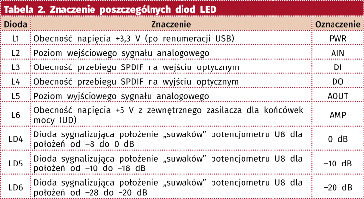 Dla sygnału z lewego kanału świeci się dioda zielona, dla sygnału z prawego kanału świeci się dioda czerwona. Jeśli obecne są sygnały w obydwu kanałach diody te świecą kolorem wypadkowym zbliżonym do żółtego (tabela 2).