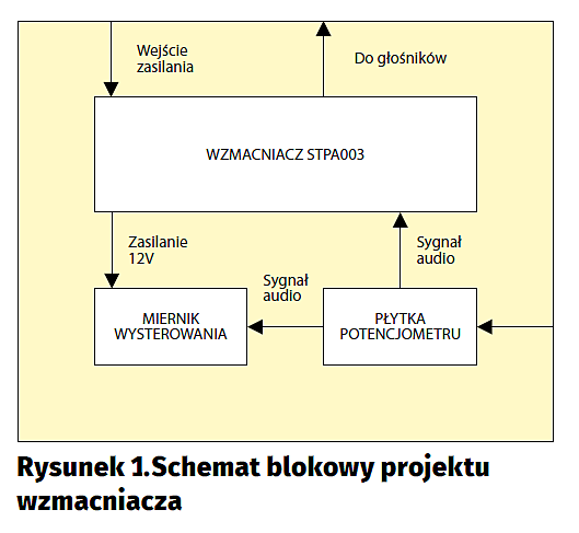 W projekcie użyto nowoczesnego układu scalonego, zintegrowanego wzmacniacza audio STPA003 firmy ST. Najważniejsze parametry układu STPA003: