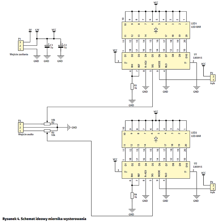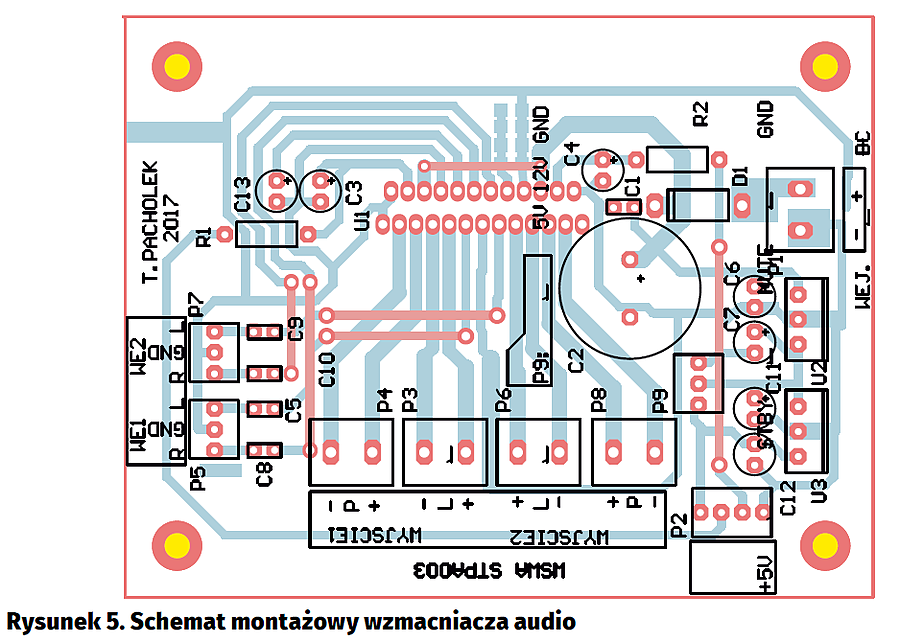 Schemat modułu wzmacniacza pokazany jest na rysunku 2. Dioda na wejściu zasilania zabezpiecza układ przed odwrotnym dołączeniem zasilania. Napięcie zasilające jest filtrowane za pomocą kondensatora i trafia do układu wzmacniacza mocy STPA003. Na płytce wzmacniacza zamontowano stabilizatory napięcia +12 V oraz +5 V. Ten drugi służy do ustalenia poziomów napięcia na doprowadzeniach sterowania trybami wyciszenia (mute) i uśpienia (standby). W zależności od tego czy do odpowiednich pinów złącza P2 zostanie dołączone napięcie +5 V wzmacniacz działa w danym trybie. Złącze P9 umożliwia dostarczenie stabilnych napięć zasilania do innych modułów w obudowie wzmacniacza.
