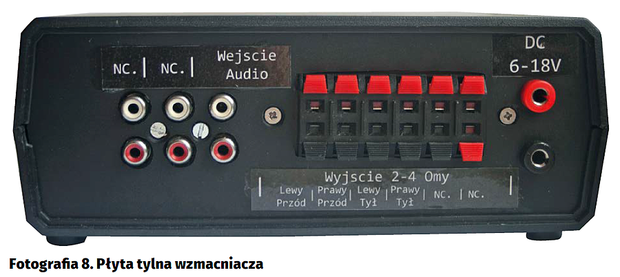 - Zabezpieczenia przeciwzwarciowe wyjścia: do masy, do napięcia zasilania oraz przed zwarciem głośników.